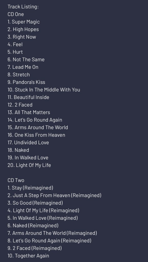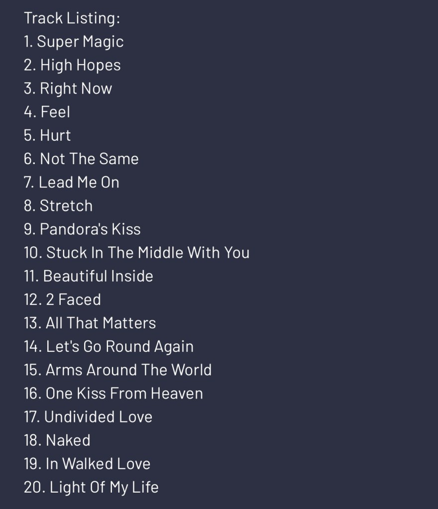 The album features 4 brand new tracks: SuperMagic, High Hopes, Right Now & Feel. It includes all her solo single releases, along with some special new versions of some of her fan favourites and will be her first with under her recent record deal with BMG and Tag8Music.
