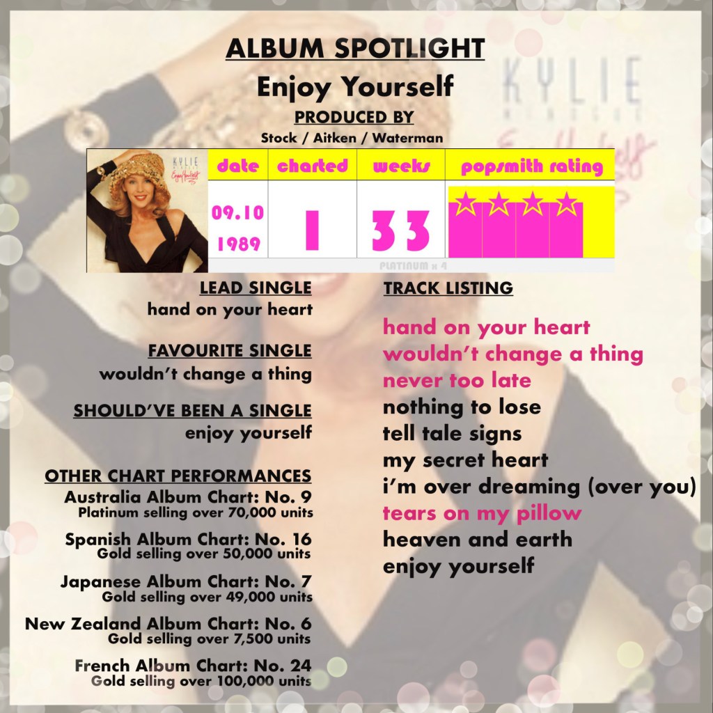 Hand On Your Heart was the first single from second album Enjoy Yourself, hitting the top spot again in the UK Singles Chart, and hitting the Top 10 in 10 countries, certified Gold in Australia and the UK.