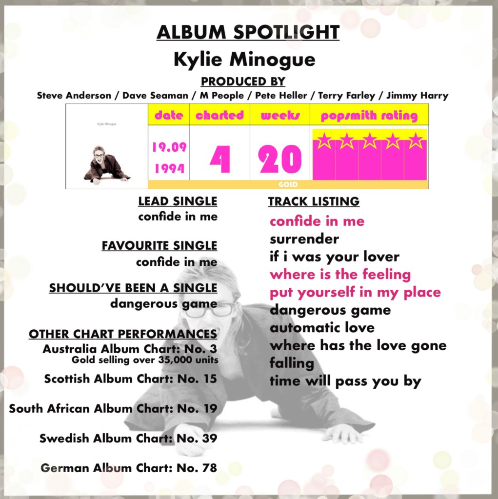 Ok, so now we have album No.5, and after a slight hiatus from being a Kylie fan, this is the album that brought me back. So much so that it was the very first album that I purchased with my own hard earned cash. I was doing work experience (still at school) and the manager gave me £20 for each week I worked (2 weeks) and I literally felt like I ruled the world!
