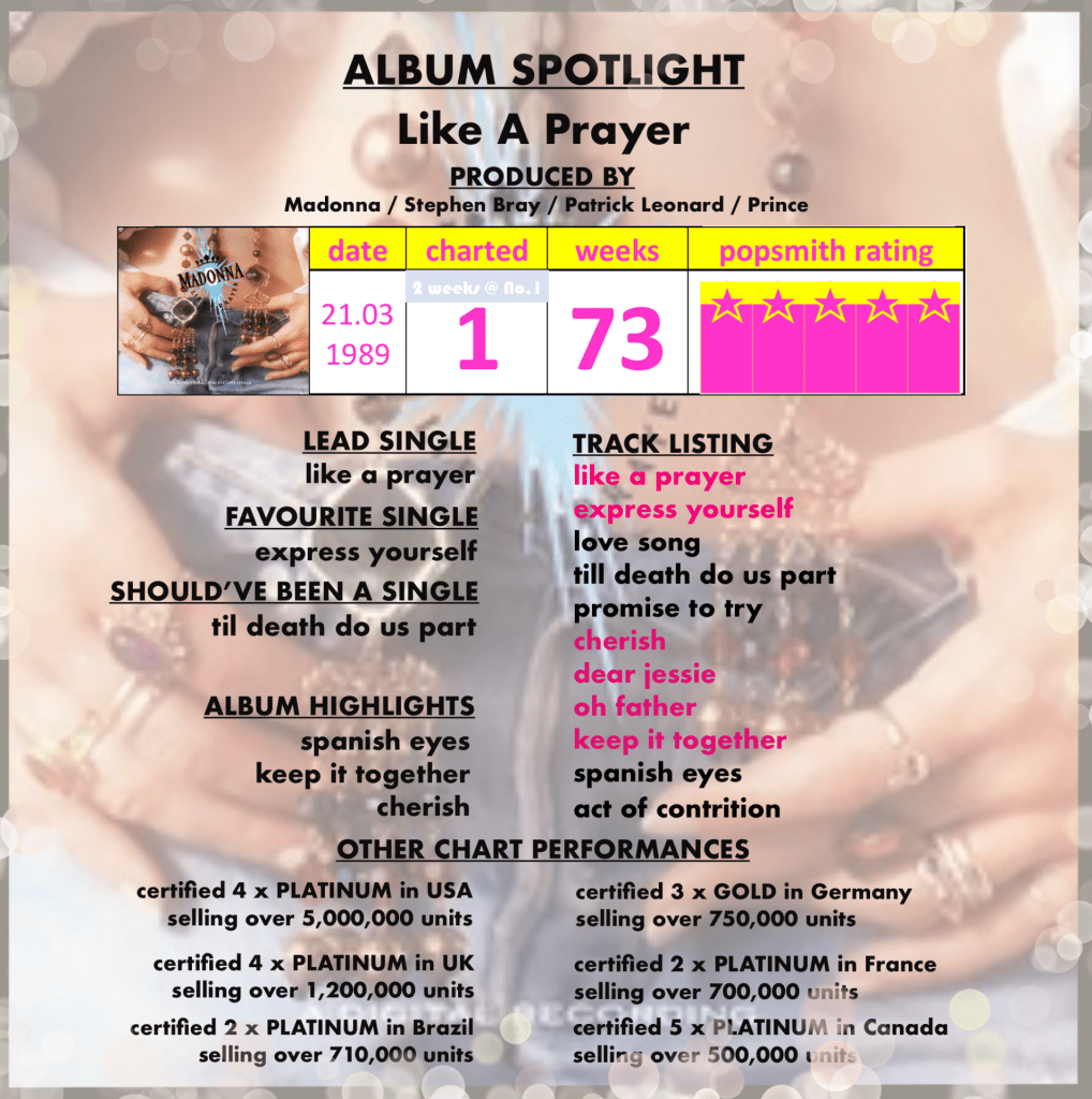 Like a Prayer was the first Madonna album I owned. I had finally succumbed, and I have not looked back since. What a strong run of singles. My favourite track was always Til Death Do Us Part which I still love but Spanish Eyes really stands out to me now. I love the rawness in her vocals.