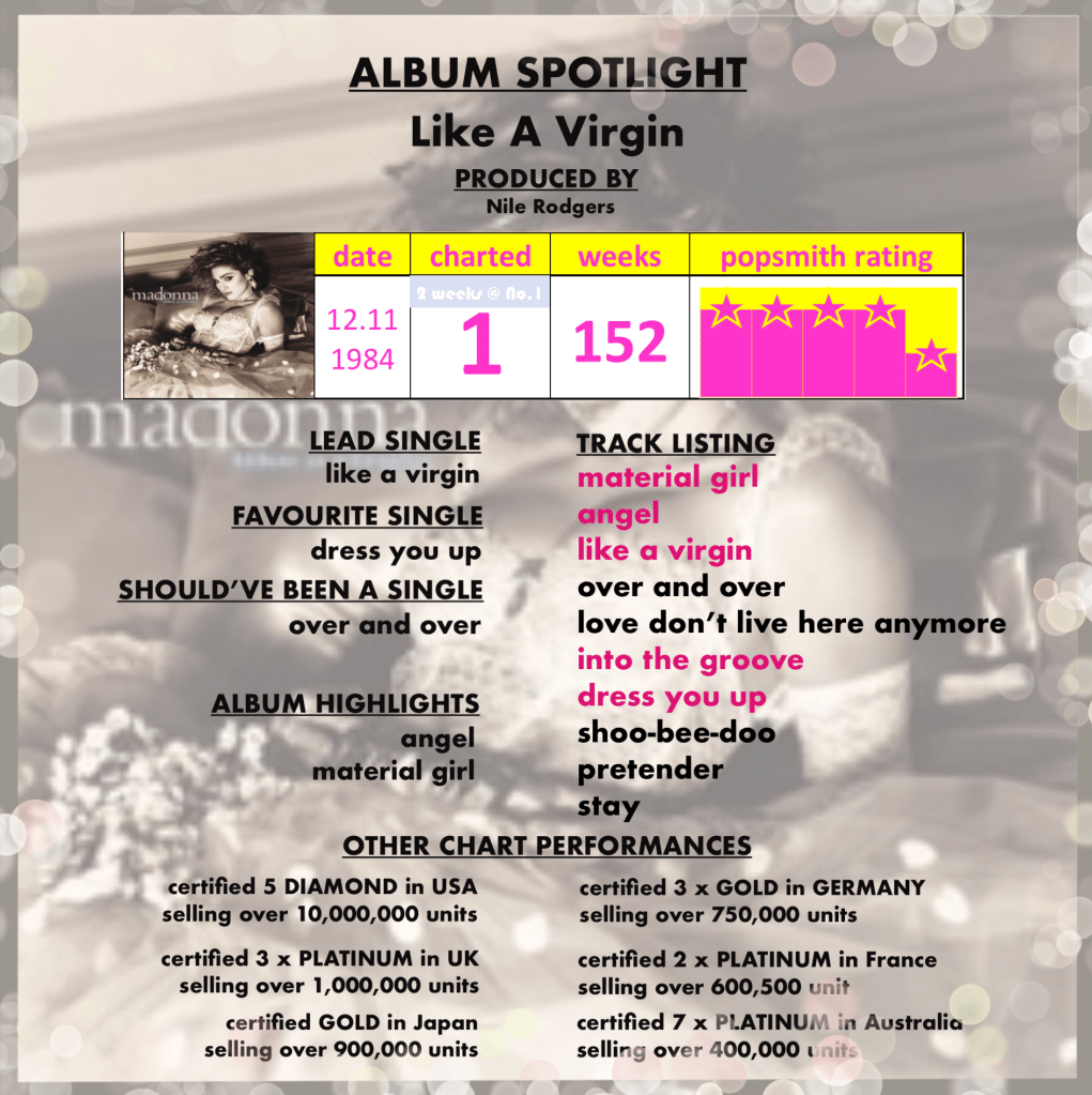 So early Madonna was a little lost on me at the time, maybe I was too young. It wasn’t until Material Girl that she really got my attention, but now I really, really love her early material. Retro is cool and you don’t get more retro than her early material. Dress You Up would be my fav but Lucky Star, Into the Groove and Angel are up there too, and who doesn’t love a bit of Holiday..!