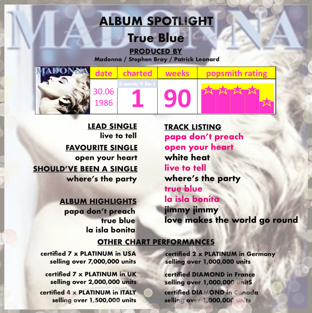 True Blue was the first album by an American artist to debut at No.1 in the UK Album Chart history, where it stayed for 6 weeks and spent a total of 85 weeks in the chart. She was really making her mark on the industry.